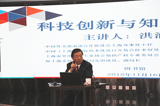 11月16日下午,为普及知识产权知识,激发广大师生员工科研创新的积极性,图书馆邀请中国外交部南南合作促进会上海办事处主任、原上海市知识产权局党组成员,副局长洪涌清前来作“科技创新与知识产权”专题讲座。副校长唐红梅、图书馆馆长彭骏、副馆长俞凯君出席讲座。来自各部门、学院约40余名师生参加讲座。
