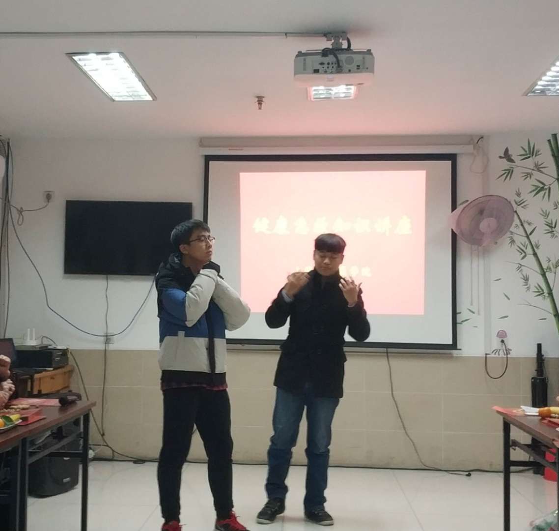紧接着乐明哲同学和寿嘉渝同学模拟了吃年夜饭时小孩噎到的场景,向老人和孩子们演示了海姆立克急救法。