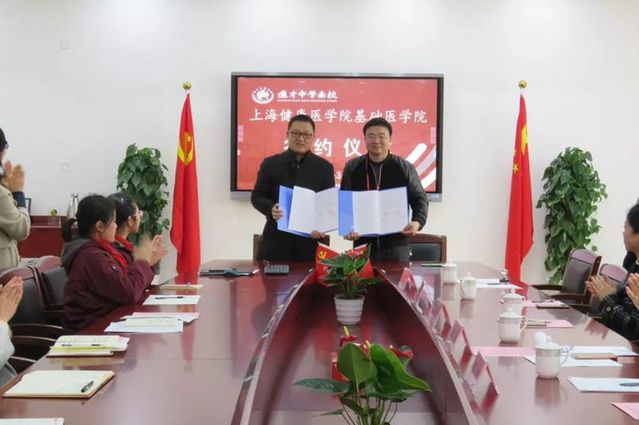 为加大学校服务社会力度,充分发挥教育资源辐射作用,推动教育资源共建共享,3月13日下午,永利集团88304官网基础医学院与上海市进才中学南校举行了合作签约仪式。出席签约仪式的有永利集团88304官网基础医学院院长杨智昉、直属党支部书记程伟、副院长汪慧菁、校党委组织部组织员陈国庆等以及上海进才中学南校校长、书记亓大江,各部门、年级、中心负责人和部分学生代表。