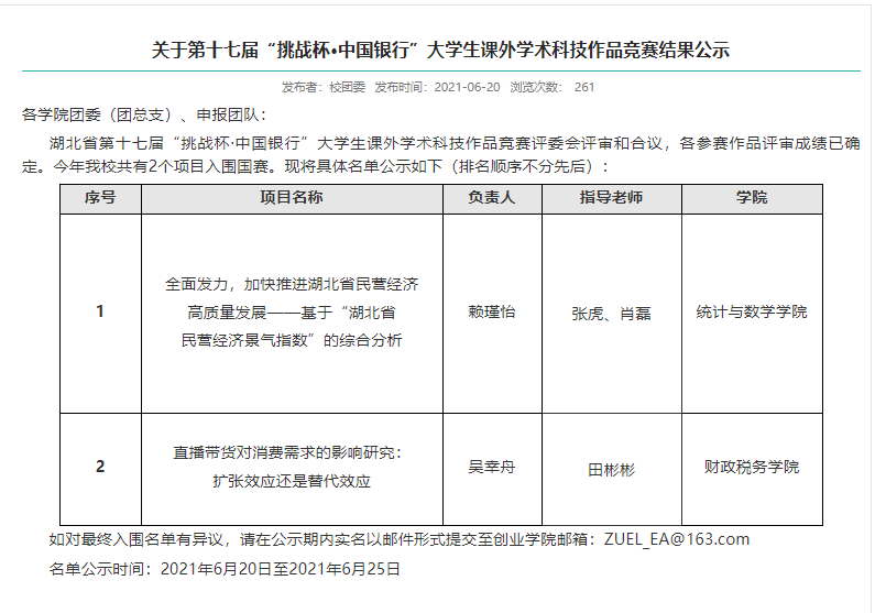近日,由团省委、省科协、省教育厅、省学联主办的湖北省第十三届“挑战杯·中国银行”大学生课外学术科技作品竞赛在中南民族大学落下帷幕。经过前期多轮的专家评审以及现场答辩,由bat365官网田彬彬教授指导的团队项目《直播带货对消费需求的影响研究:扩张效应还是替代效应?》(团队成员:吴幸舟、杨婉云、丁婉睿、吴亚丁、郑嘉梁)荣获省一等奖,并获得了代表学校参加全国大赛的资格。据悉,此次获奖是bat365官网近年来在“挑战杯”系列赛事中获得的最好成绩,反映了学院在人才培养,尤其是强化本科生班级导师制方面的最新成果。