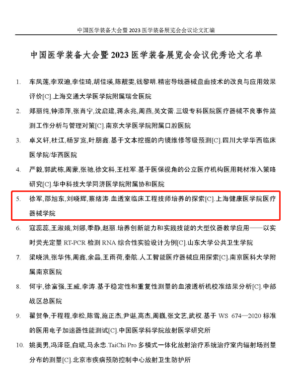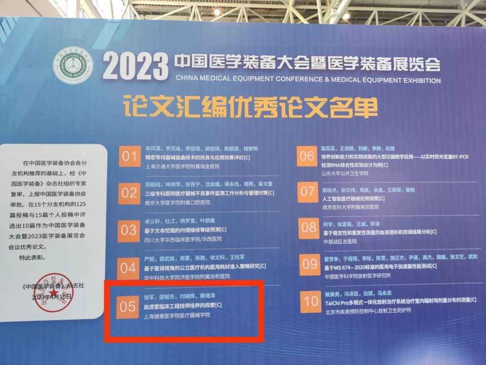4月25日-27日,2023年中国医学装备大会暨医学装备展览会在重庆召开,永利官网医疗器械学院教师徐军根据目前血透工程师的现状及多年在血透教学工作中的经验,撰写了《血透临床工程技师培养的探索》论文并以血液净化装备专业技术委员会委员身份向大会投稿,经血液净化装备专业技术委员会推荐和《中国医学装备》杂志社组织专家复审,被中国医学装备协会评为本次大会论文汇编优秀论文。