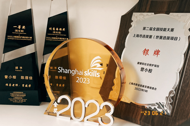 现在回头看来时的历程,没有想到能走到今天这一步。以前看到公众号推送的报道,吴怡欣师姐在第46届世界技能大赛特别赛中夺得铜牌,实现了中国在该项目上零的突破,实在振奋人心。我明白成功背后需要付出巨大的努力,也将以师姐为目标不断鞭策自己。”而今,曾小桉已在路上。“我的目标就是做到像比赛专家裁判组说的那样——保持照护者的专业性,与患者共情,基于患者的需要和喜好提供帮助,做有温度的照护者。”接下来,她将积极备战,努力提升自己的各方面能力。今年9月,曾小桉将代表上海市出征第二届全国技能大赛健康与社会照护项目,祝愿她乘风破浪,勇往直前。