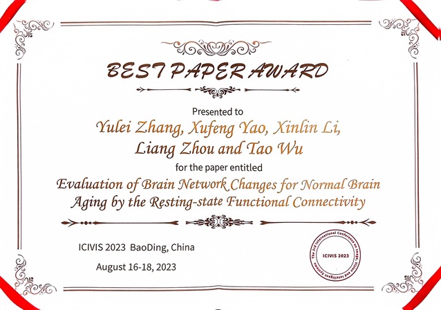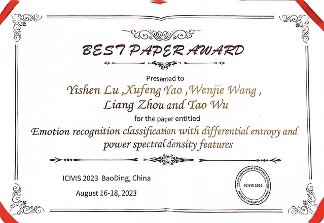 本次会议,研究生鲁一燊和李迪分别以“Emotion Recognition Classification with Differential Entropy and Power Spectral Density Features和Research on Brain Age Prediction Based on Dual-Pathway 3D ResNet”为题,作了精彩的英文汇报。同时,本次会议录用永利官网医学影像学院教师、研究生和本科生文章8篇,其中鲁一燊的《Emotion Recognition Classification with Differential Entropy and Power Spectral Density Features》和张玉蕾的《Evaluation of Brain Network Changes for Normal Brain Aging by the Resting-state Functional Connectivity》论文荣获会议最佳论文奖。