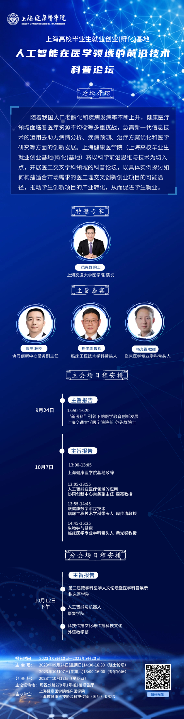 为了推动医学和健康事业发展,深化医工交叉融合,永利官网上海市高校就业创业基地定位培养具备健康数据的采集、传输、存储、统计、分析、可视化等能力的基层卫生人才。现定于9月24日-10月12日(9月24日院士主旨报告,10月7日主论坛,10月12日分论坛)开展人工智能在医学领域的前沿技术科普论坛,旨在培养能够在医疗卫生机构、医疗信息行业、健康产业等相关企事业单位从事大数据分析与管理、处理和开发,管理与维护等工作的高素质医学类应用型专门人才。