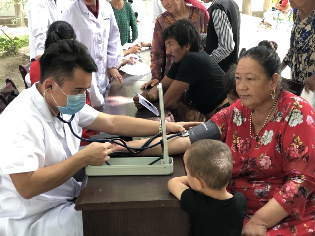 8月16日,专家们来到阿克萨克马热勒乡卫生院和琼库尔恰克乡中心卫生院,进行义诊、带教查房、健康宣教、发放科普宣传资料和赠书等活动。义诊过程中,专家们指导高血压急症患者用药,为当地居民检查眼睛,为孩子诊治哮喘,为居民们开处方,进行了暖心的专业服务,得到了患者们一致好评。此次义诊活动,共接待群众义诊咨询120余人,调研医务工作者人员20余名。