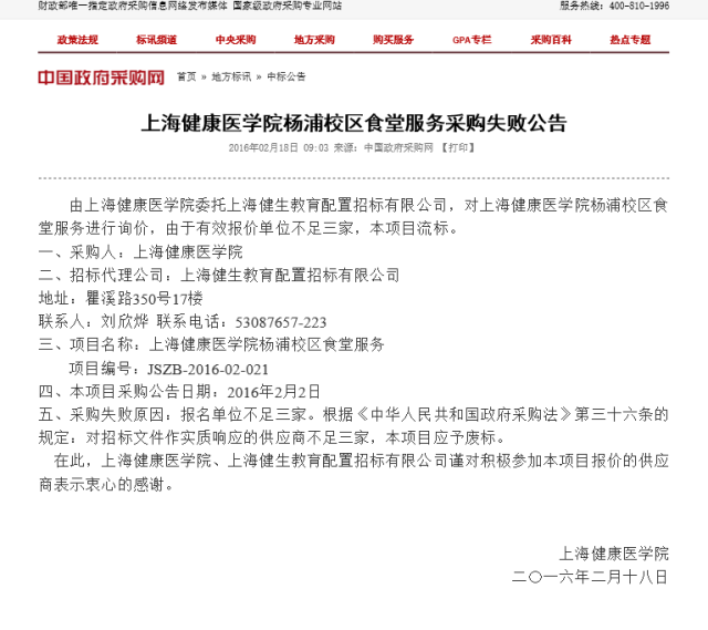 永利集团88304官网杨浦校区食堂服务采购失败公告