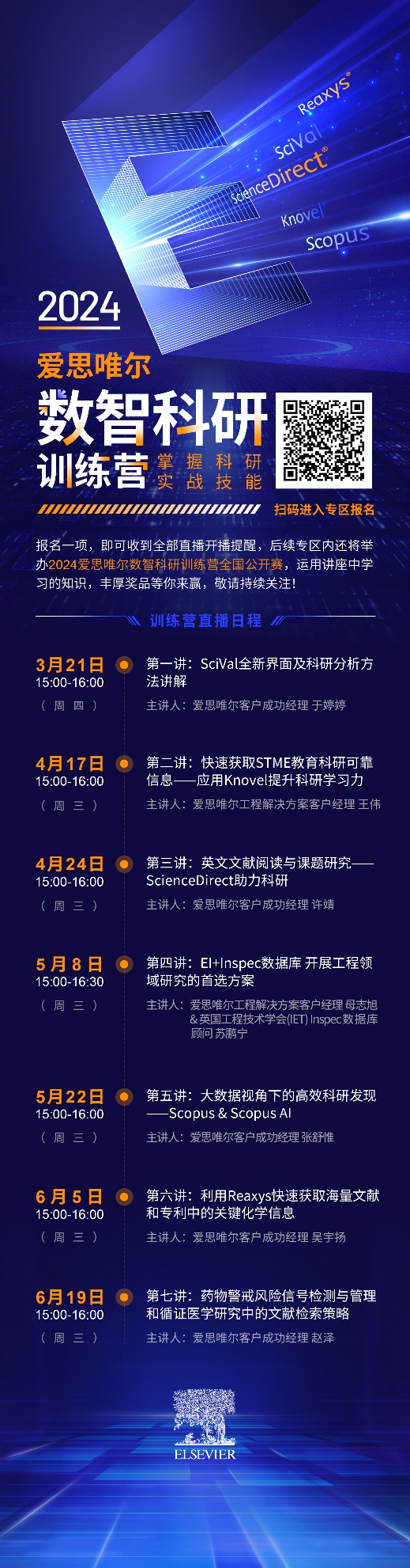 为助力科研人员提升科研效率、解决实际问题,我们特别启动了2024爱思唯尔数智科研训练营!