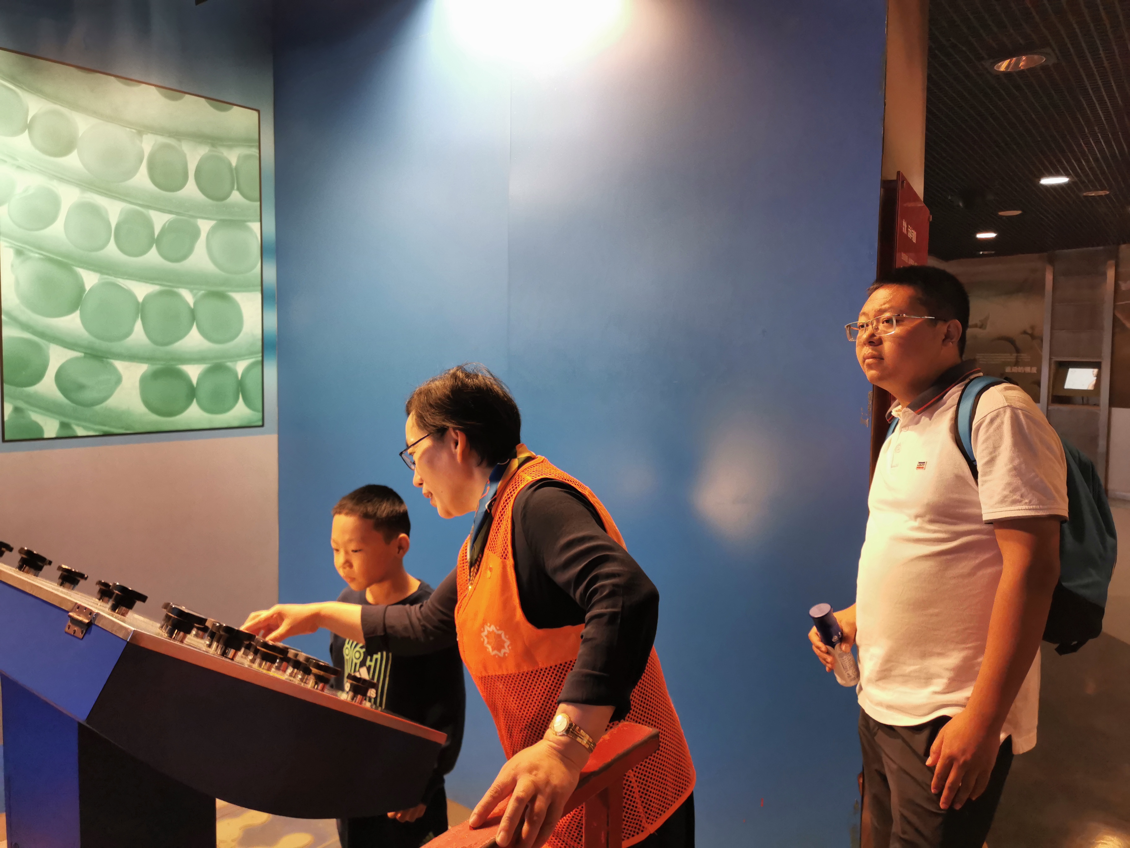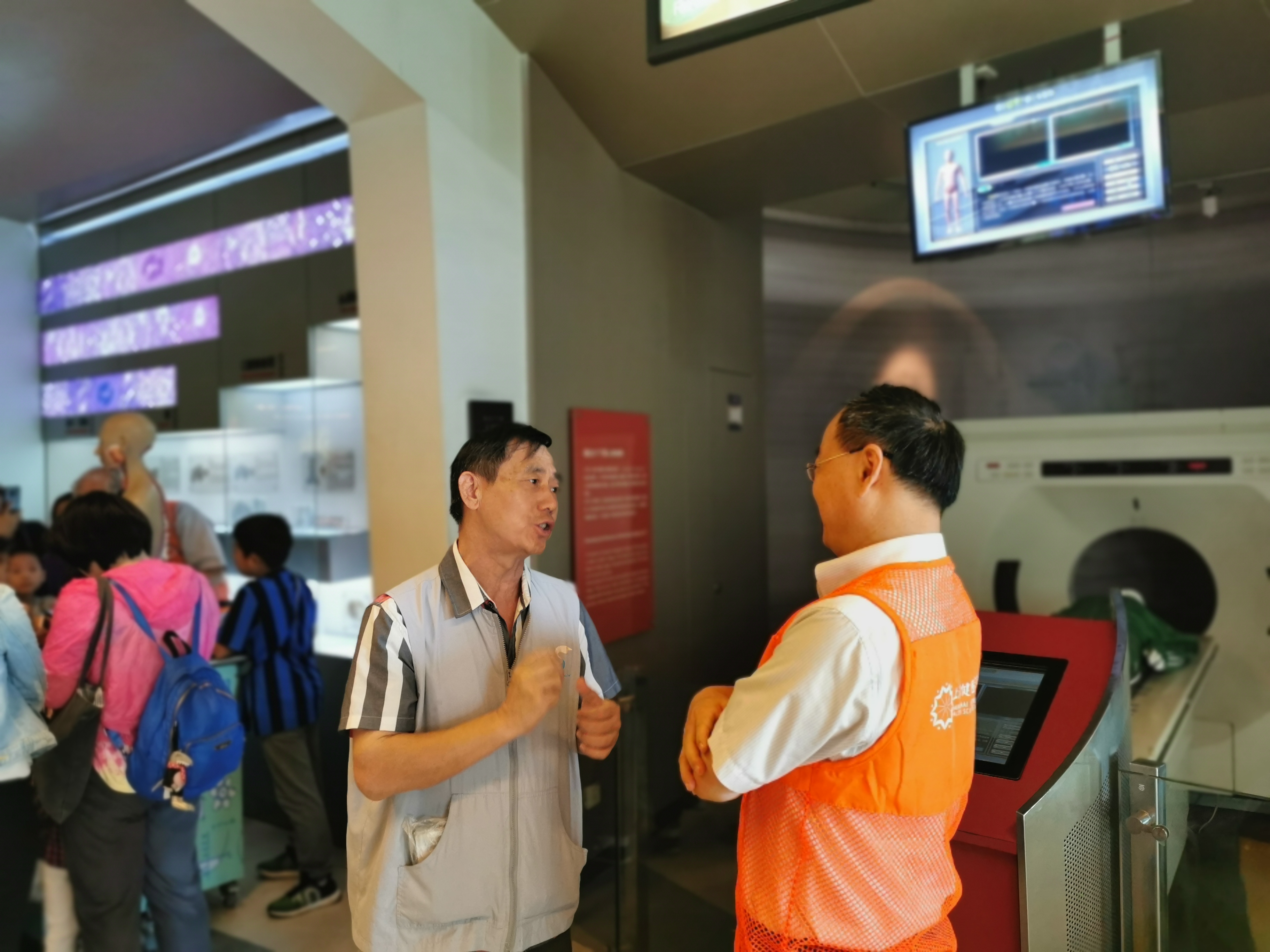 在科技馆三楼“人与健康”馆内,校党委书记郑沈芳、校长黄钢代表学校看望慰问了假期中坚守一线的学校退休教师、毕业学生和教师志愿者代表,并为游客们耐心讲解,这是继今年6月带领首届本科毕业生来这里上好“最后一课”后的再次相约。