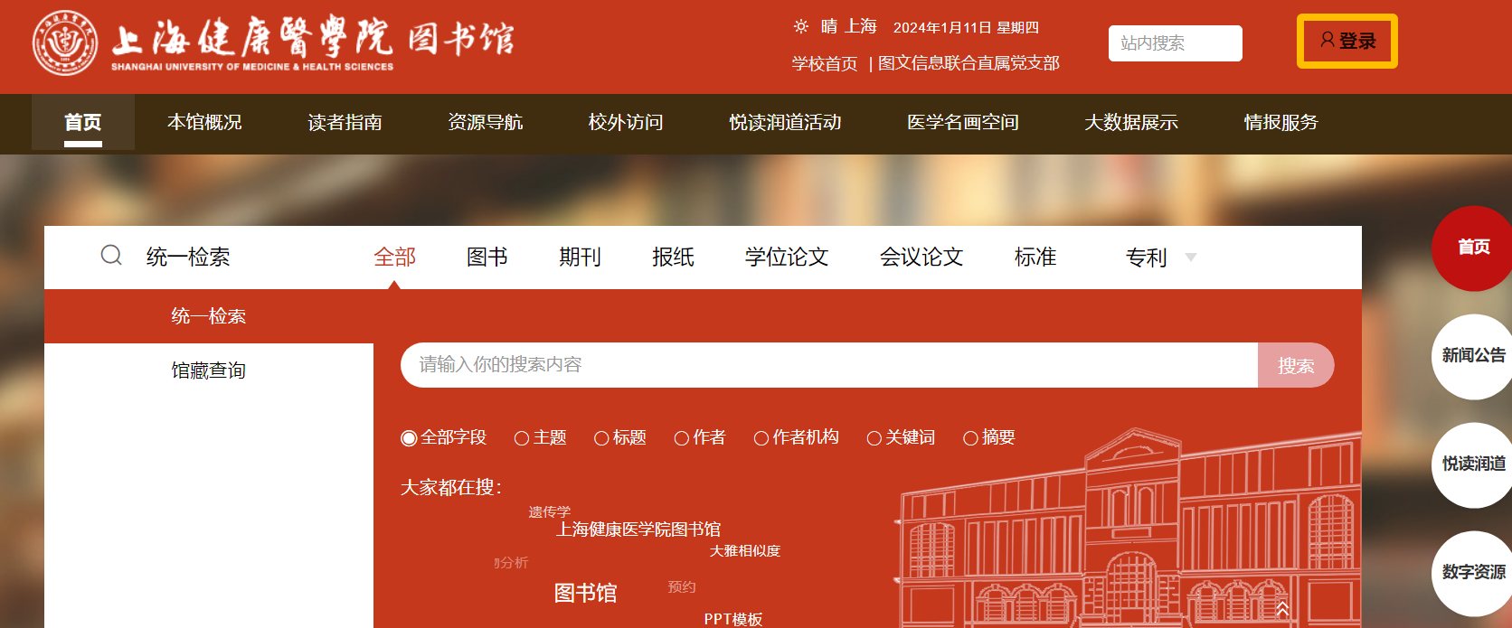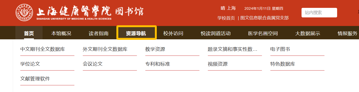 登录永利集团88304官网图书馆门户网站(https://lib.sumhs.edu.cn/),点击右上角登录,完成统一身份认证,可通过资源导航或数字资源,直接访问各类型数字资源。