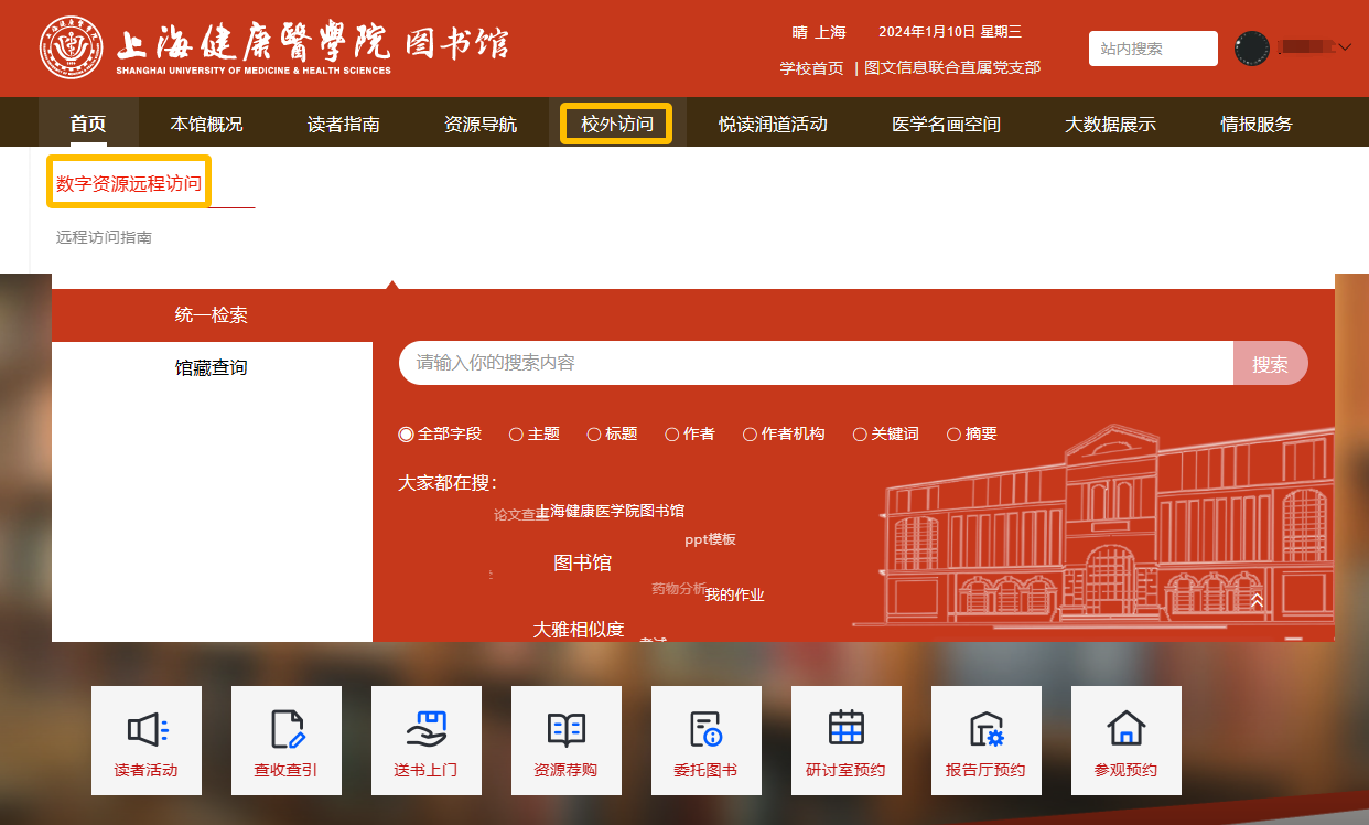 直接输入URL链接:/index.html或登录永利集团88304官网图书馆门户网站(https://lib.sumhs.edu.cn/),导航栏点击校外访问和数字资源远程访问,可直接进入远程访问系统登录界面,具体可参考站内《远程访问指南》。