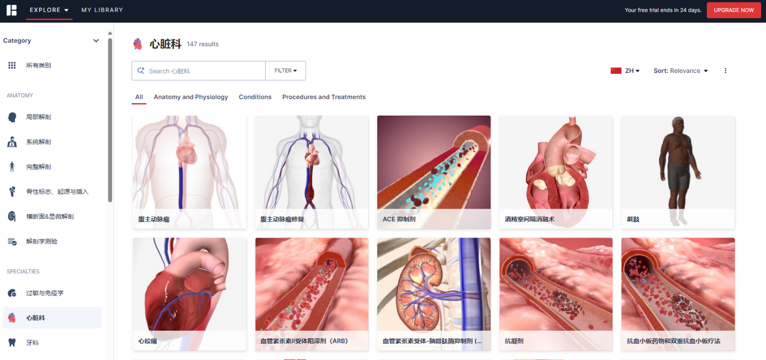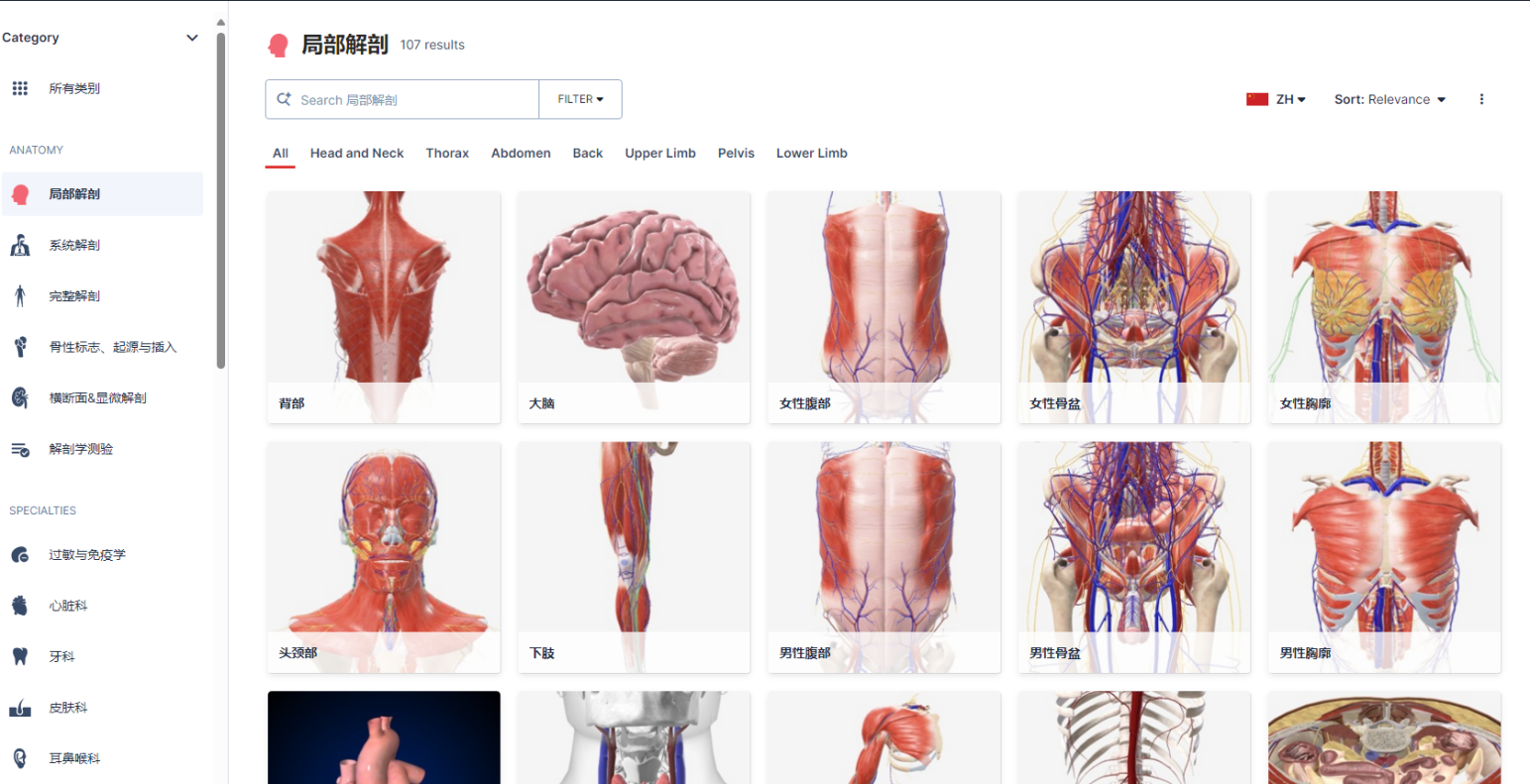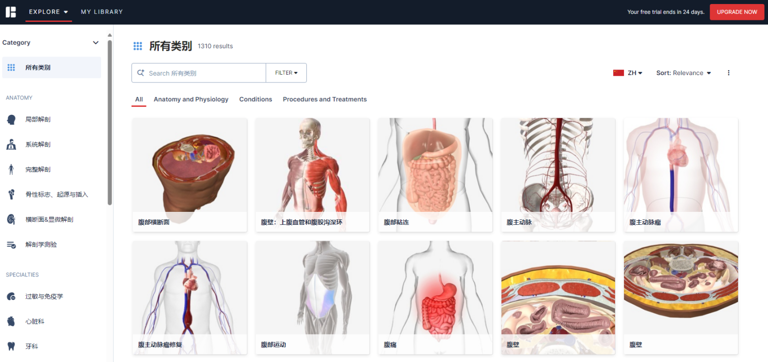 3、首页可点击“Explore”菜单选择分类,包括解剖的分类和各个学科的分类。