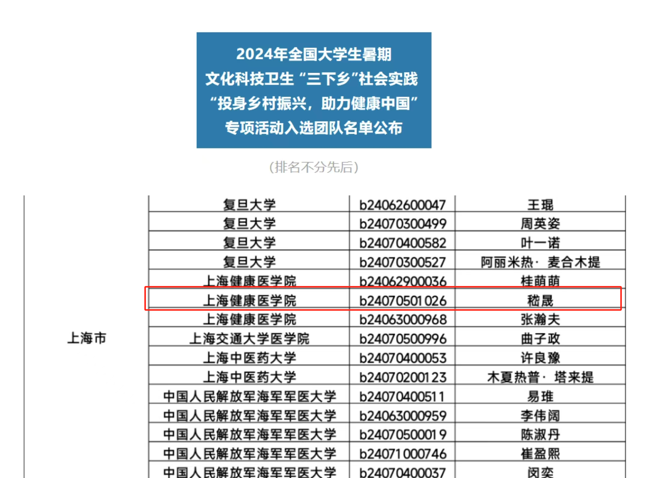 2024年全国大学生暑期文化科技卫生“三下乡”社会实践“投身乡村振兴,助力健康中国”专项活动得到全国各医药类高校团队的广泛关注,在全国众多医学院校中遴选出300支大学生社会实践团队,共有来自108所学校的2764名大学生入选,永利官网护管学院AHFE团队项目“医缘庐江党建牵,分级诊疗心相连”成功入围,上海仅15支团队入围。