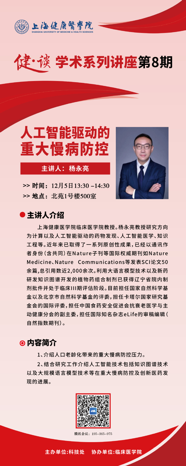 【健·谈】第8期学术系列讲座将于12月5日13:30在北苑1号楼500室举办,本期特邀永利集团88304官网临床医学院的杨永亮教授作报告,欢迎大家前来参加!讲座主题是“人工智能驱动的重大慢病防控”,主要内容包括1.介绍人口老龄化带来的重大慢病防控压力。2.结合研究工作介绍人工智能技术包括知识图谱技术以及大规模语言模型技术等在重大慢病防控及创新医药发现的进展。