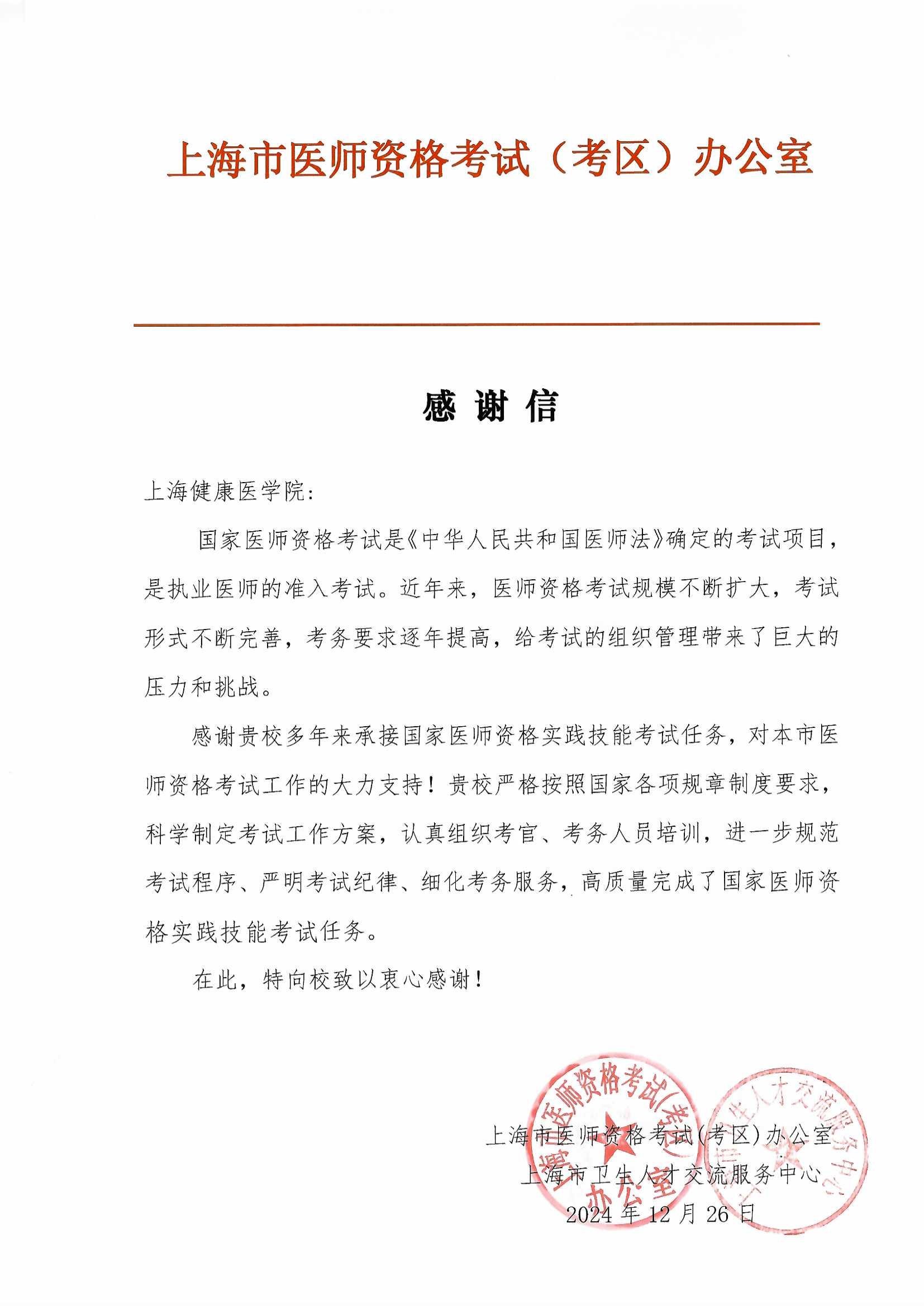 近日,永利官网收到上海市医师资格(考区)办公室的感谢信,信中肯定了永利官网实践教学中心在国家医师资格考试中的严谨组织、规范化流程以及高质量考核服务,并表达了衷心的感谢。