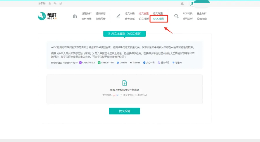 登录笔杆网,选择AIGC检测功能进入页面