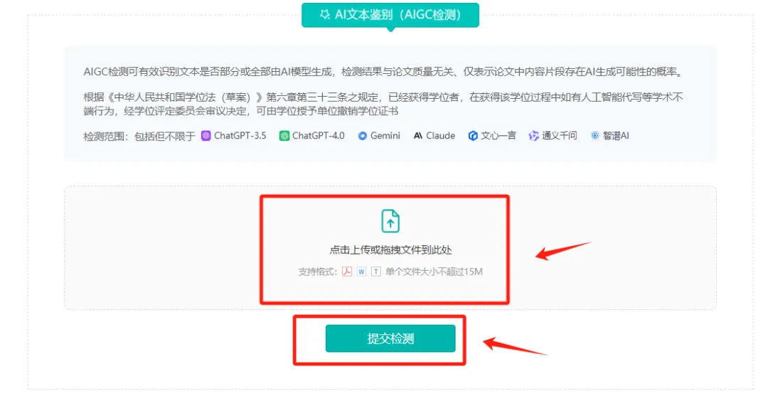 上传的文档:1.AIGC检测不要超过15M;2.普通论文查重不要超过30M。