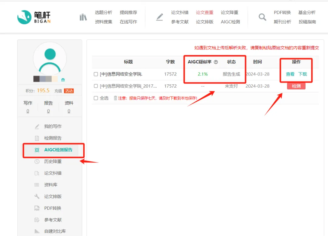 提交检测后,需等待1-3分钟,即可在个人中心中查看相关信息,报告生成后仅保存七天,需及时下载到本地。