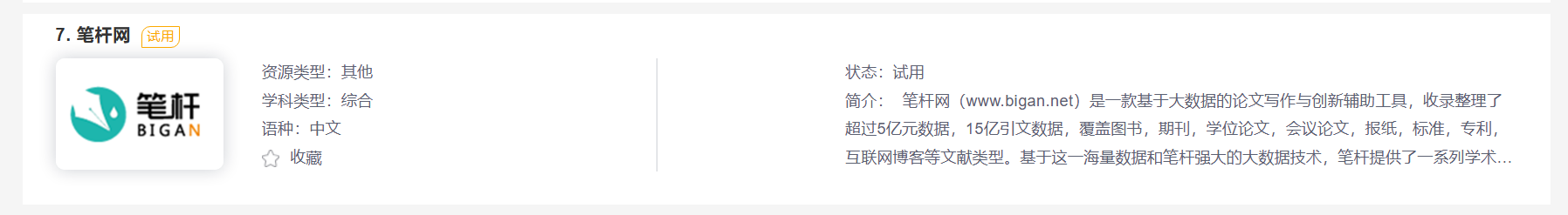 在校园网环境下登录图书馆门户网站(https://lib.sumhs.edu.cn/),在数字资源“更多“中选择中文试用数据库,找到“笔杆网”数据库(https://www.bigan.net/)