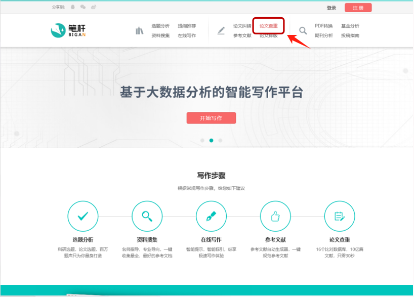 点击页面上方处“论文查重”按钮即可进入论文查重功能页面