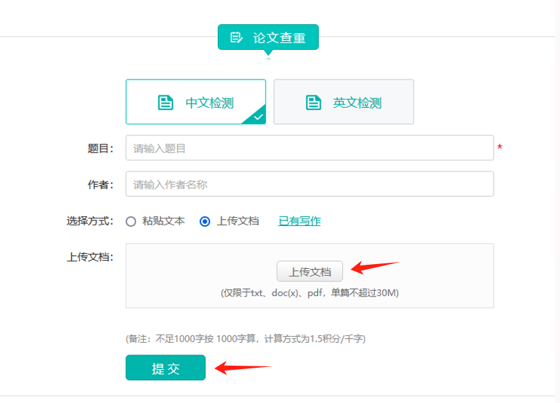 选择需要的检测语言后,选择“上传文档”按钮,点击下方“上传文档”,将论文文档上传至平台,点击“提交”即可。