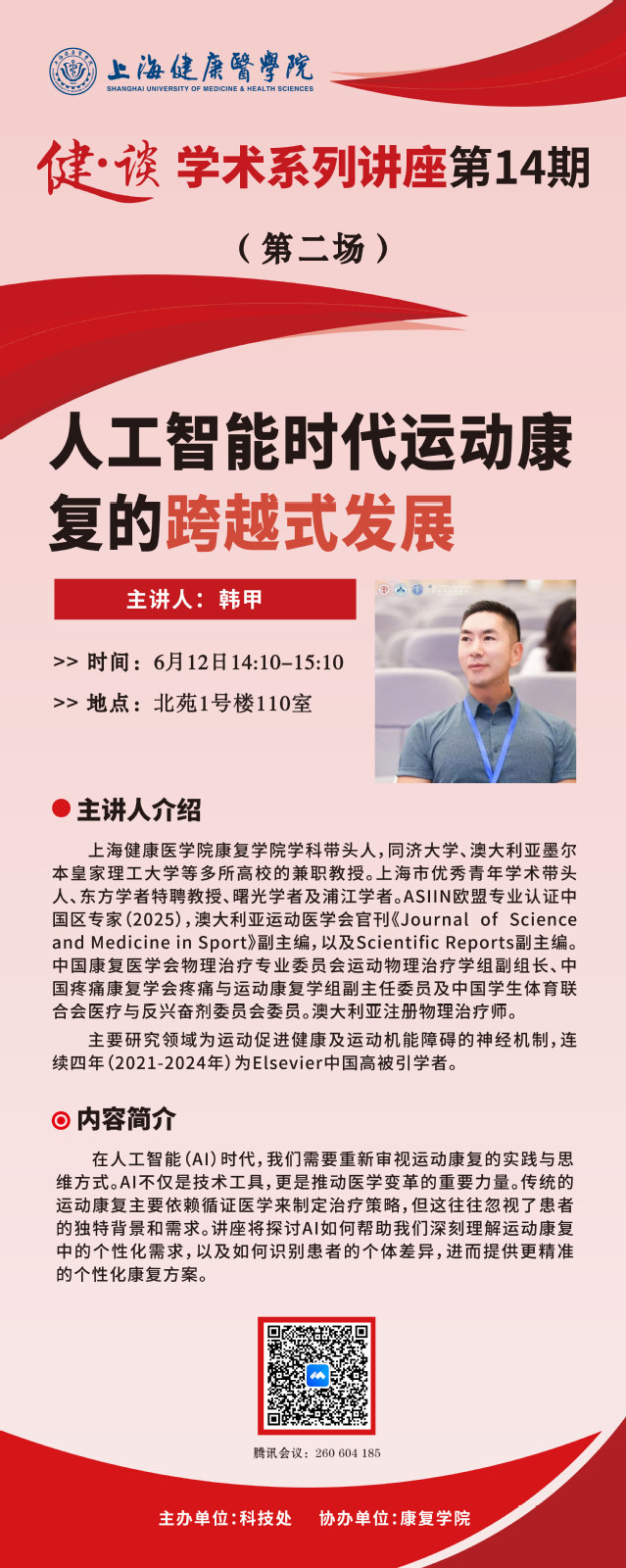第二场将于2025年6月12日14:10在北苑1号楼110室举办,特邀永利集团88304官网康复学院学科带头人韩甲教授,作主题为“人工智能时代运动康复的跨越式发展”的报告。