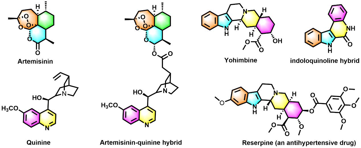 分子杂交(Molecular Hybridization, MH)是一种重要的新药研发策略,其核心思想是将不同结构的药效团进行融合,生成一种新型杂交化合物。由于所采用的药效团均已通过药代动力学评估,因此该策略有望生成活性更高的新型融合分子。近年来,科学家利用分子杂交策略在抗疟、抗癌、抗菌和抗焦虑领域的药物研发中取得了显著性进展。例如,恶性疟原虫对现有的抗疟疾药物(青蒿素,奎宁)产生耐药性。而将青蒿素与奎宁融合形成的“青蒿素&奎宁”杂交分子,可有效对抗多重耐药性的疟原虫(图1)。此外,吲哚和喹啉骨架均被视为药物化学中的优势结构,吲哚并喹啉杂合子是一类重要的生物碱,如壮阳药物育亨宾、降血压药物利血平及吲哚并喹啉(图1)。考虑到吲哚并喹啉杂合子展现出的广谱的药理活性,研究人员针对该骨架的合成开展了大量探索性工作。