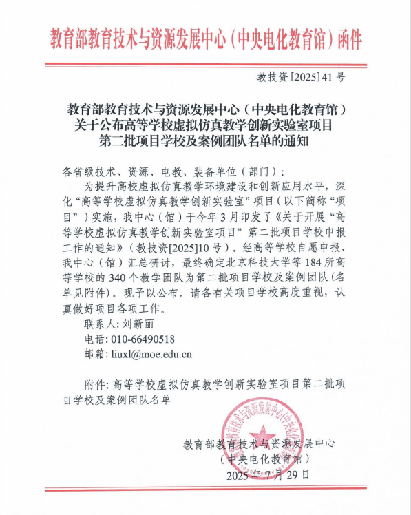 近日,教育部教育技术与资源发展中心公布高等学校虚拟仿真教学创新实验室项目第二批项目学校及案例团队名单(教技资〔2025〕41号),永利官网2个案例成功入选。
