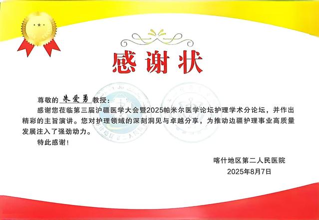论坛期间,校领导及代表团与行业专家学者深入沟通交流,就沪疆医学协作深化发展、应用型医学人才培养、老年护理服务体系构建、智慧医疗技术应用推广等议题进行了广泛而深入的探讨。护理与健康管理学院朱爱勇院长在护理学术分论坛作主旨演讲,并获论坛感谢状。