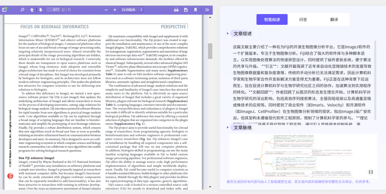 文章详细页面,点击论文对话,用AI来解读论文。如果平台没有全文下载地址,用户可上传PDF来进行对话,大模型会根据全文内容自动生成综述、文章脉络图、问答,并对全文进行翻译。