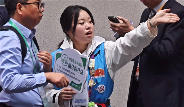 相较于去年的懵懂青涩,今年的庚窈竹显得更加沉稳和专业。她对岗位职责有着清晰而深刻的认知。控烟管理是爱国卫生与健康促进岗位的重要工作之一,也是对“小叶子”们沟通能力和耐心的考验。庚窈竹和伙伴们每天都会随身携带灭烟袋,在展会场馆内不间断巡逻,遇到吸烟的观众或展商,便会微笑着上前礼貌劝阻。“您好,为了您和他人的健康,场馆内是无烟区域,麻烦您前往指定的吸烟点吸烟,谢谢配合。”这样的话,她每天要重复上百遍。