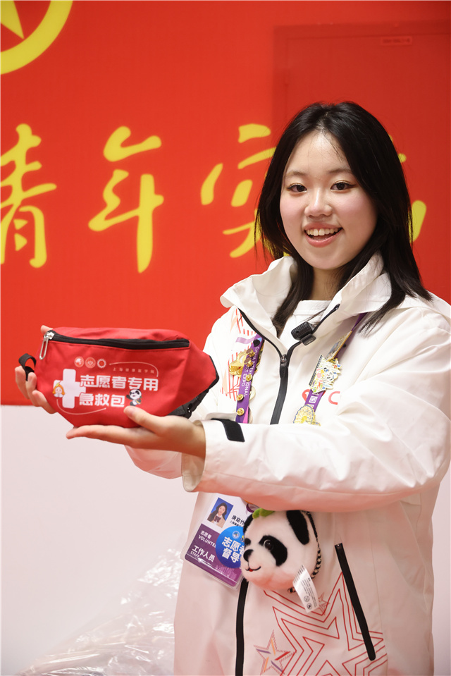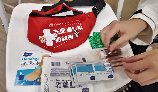 “能用课堂上学到的专业知识帮到大家,那种成就感特别强烈,也让我更深刻地感受到了作为医学生的责任与价值。”庚窈竹说,急救包虽小,却承载着守护健康的重量。有一次,展馆内一位观众不小心被展品包装的硬纸壳划破了手指,鲜血瞬间渗出,显得有些手足无措。正在附近的庚窈竹立刻上前,从急救包里拿出消毒棉片仔细擦拭伤口,再贴上防水创可贴,整个过程快速而规范。这位观众连连感谢,还竖起了大拇指。这份认可,让庚窈竹更加坚信,小小的急救包往往能发挥大作用。