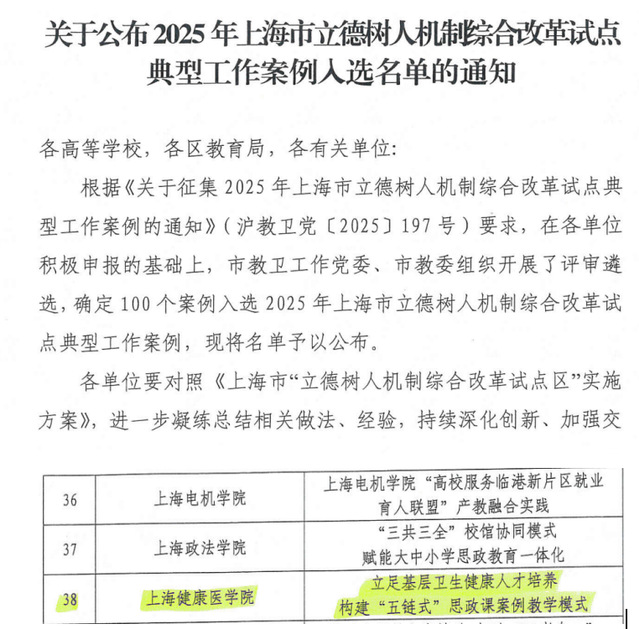 近日,中共上海市教育卫生工作委员会、上海市教育委员会公布了2025年上海市立德树人机制综合改革试点典型工作案例入选名单,由永利官网马克思主义学院报送的《立足基层卫生健康人才培养 构建“五链式”思政课案例教学模式》案例成功入选。此次案例入选是学校落实立德树人根本任务,持续深化新时代思政课改革创新的一项重要成果,是马克思主义学院推进以习近平新时代中国特色社会主义思想为核心内容的课程体系建设,努力打造“人民健康”2.0版思政大课实践探索的重要成果。