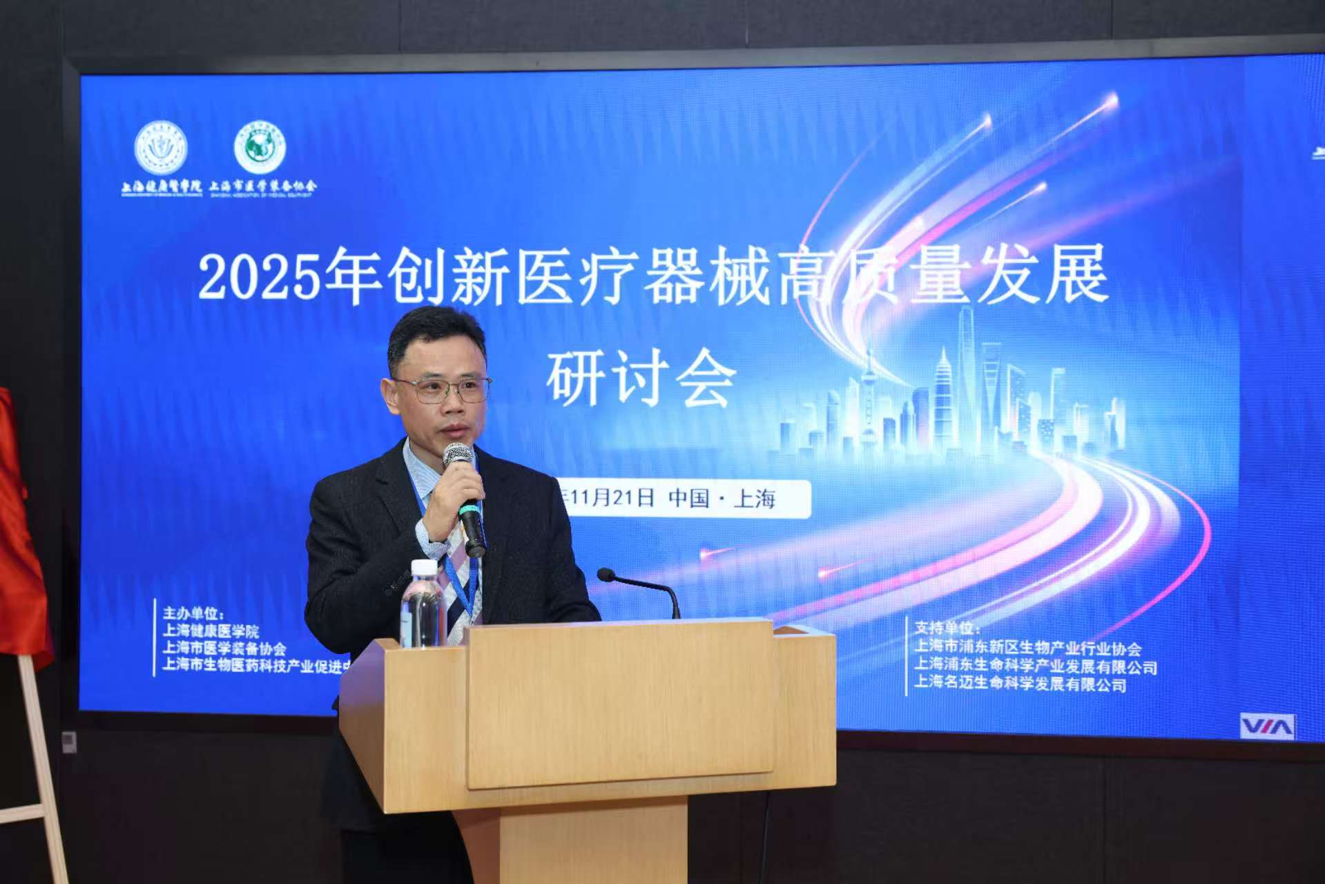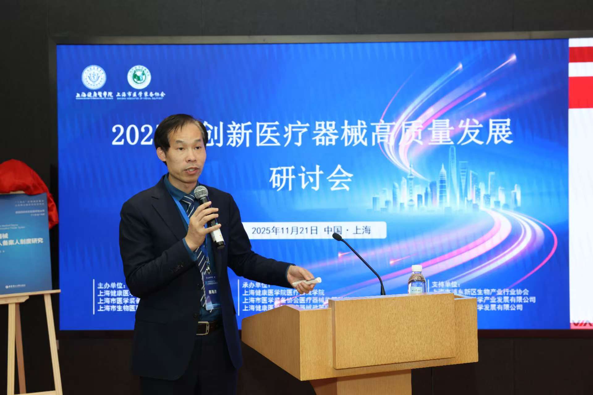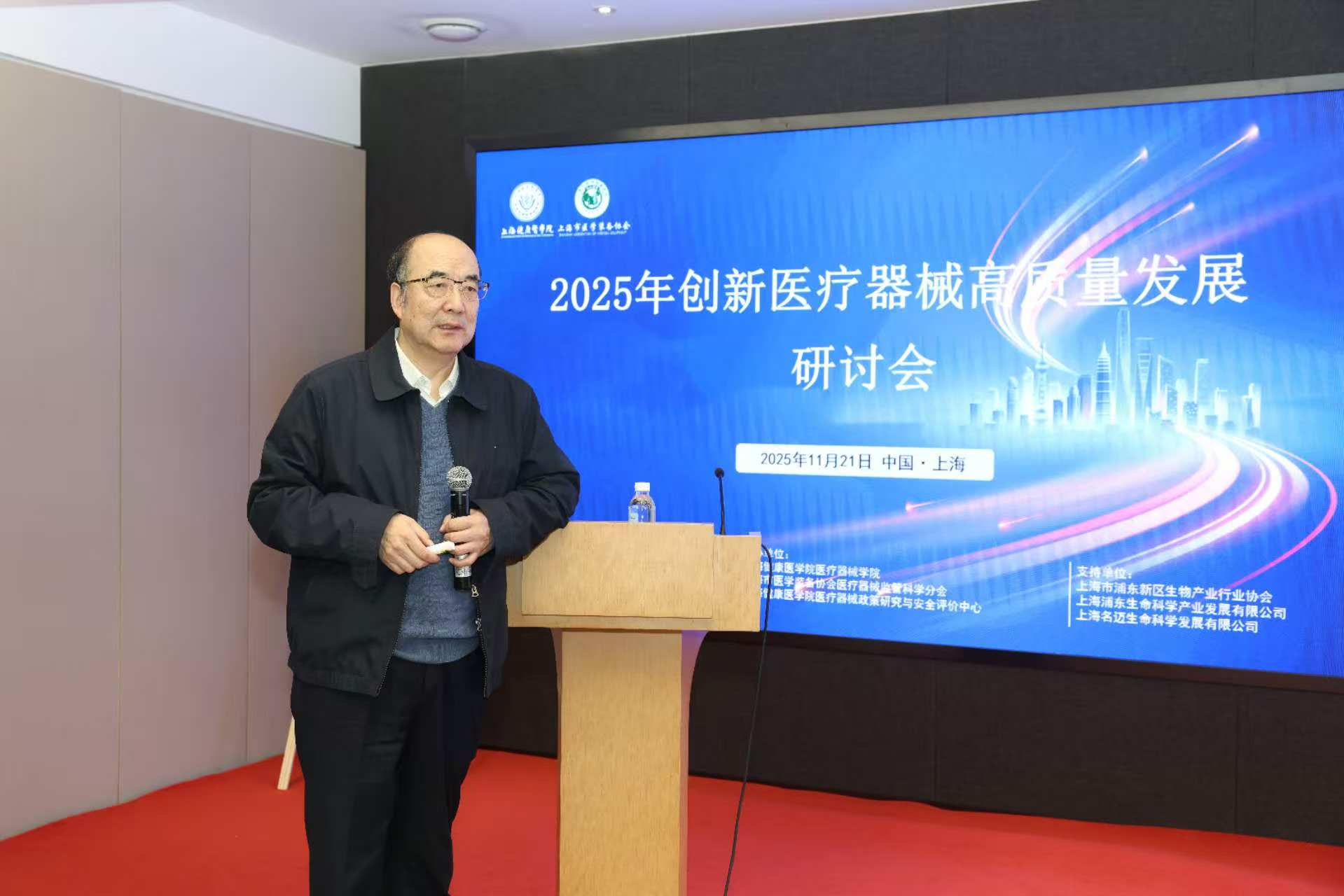 2025年11月21日,由永利集团88304官网、上海市医学装备协会、上海市生物医药科技产业促进中心联合主办,永利集团88304官网医疗器械学院、上海市医学装备协会医疗器械监管科学分会、永利集团88304官网医疗器械政策研究与安全评价中心承办的创新医疗器械高质量发展研讨会在上海泰隆银行大厦三楼会议室举行。本次会议汇聚了政府领导、高校专家、医疗机构代表及企业精英,共同围绕创新医疗器械的准入、审评、转化与管理等关键议题展开深入交流。