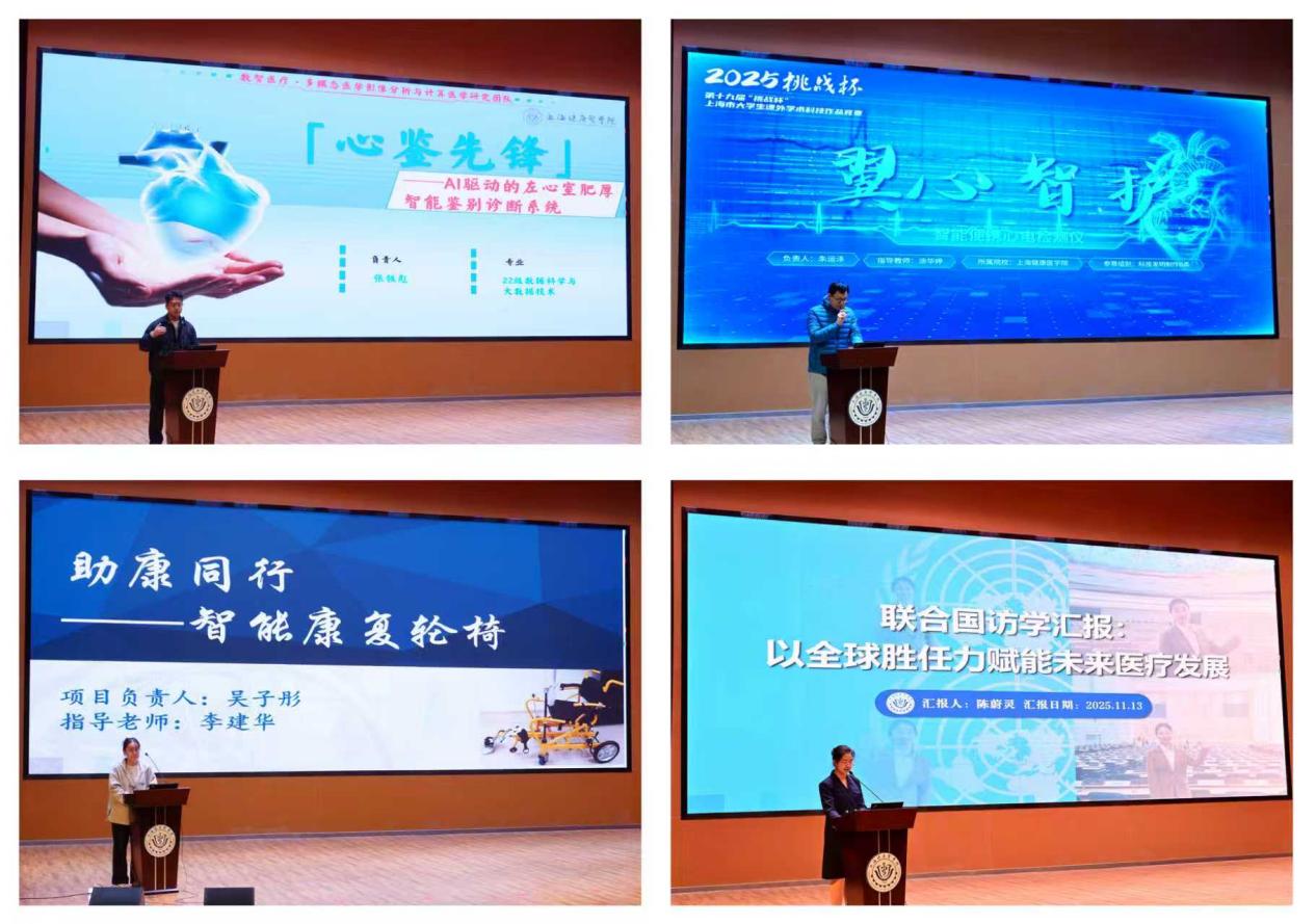 在优秀创新创业项目分享环节,医疗器械学院各团队学生代表依次展示项目成果。2022级数据科学与大数据技术专业学生张铁彪展示了其团队项目“心鉴先锋—AI驱动的左心室肥厚智能鉴别诊断系统”,该项目精准聚焦心血管疾病早期筛查的临床难点,通过深度融合医学影像数据与前沿机器学习算法,成功构建了高精度的智能鉴别模型。2023级临床工程技术专业学生朱运泽分享了其团队项目“翼心智护——智能便携心电检测仪”,该项目直面基层医疗中“心电监测不便”的核心需求,通过攻克设备小型化、数据稳定传输等关键技术,立志于研发一款轻量化、易操作的智能检测工具。2024级学生吴子彤分享了“智能康复轮椅”项目的研发历程,团队深入调研残障人士与术后患者的实际康复需求,积极响应相关政策,通过融合节能环保设计与MEMS传感器等关键技术,开发出具备数据精准、能耗较低等优势的智能轮椅产品。