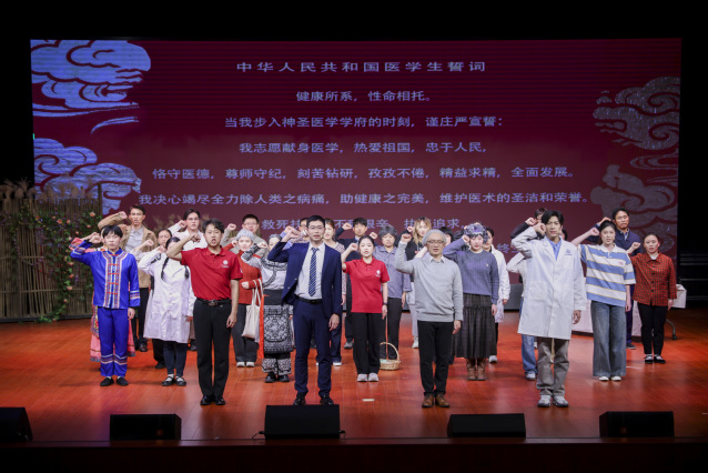 《衣被天下》不仅是一场艺术演出,更是一次面向医学生的生动思政教育。剧中通过袁满、周远航、张岚等青年学生的思想碰撞与成长蜕变,直观展现了医学教育中专业培养与人文塑造并重的重要性。当剧中人物从困惑、挣扎到感悟、坚定,领悟到“医学的真谛在于为人民的健康服务”,最终举起右手庄严宣誓“竭尽全力除人类之病痛,助健康之完美”时,台下不少师生眼含热泪,掌声经久不息。这既是对剧中人的认可,更是对自身职业初心的重温与确认。