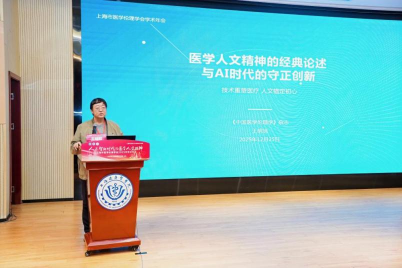 《中国医学伦理学》杂志主编王明旭作了题为《医学人文精神的经典论述与AI时代的守正创新》的主旨报告。他指出,在人工智能上升为国家战略、医学领域成为AI重要战场的时代背景下,医学人文精神不仅是历史的传承,更是引领AI医疗健康发展的价值基石,他强调“守正”——即坚守医学“以人为本、敬畏生命、共情同理、伦理自觉”的人文本质;同时提出“创新”——在AI技术全面融入医疗的进程中,必须通过科技与人文的深度融合,构建有温度的智能医疗体系。