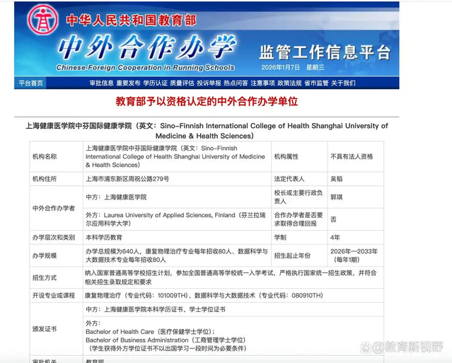 根据教育部中外合作办学监管工作信息平台公布的最新“教育部审批和复核的机构及项目名单”,教育部正式批准在上海设立两所中外合作办学机构——上海交通大学张江国际理工学院和永利集团88304官网中芬国际健康学院,两所学院将于2026年启动首届招生。澎湃新闻记者1月7日也从校方确认了上述消息。