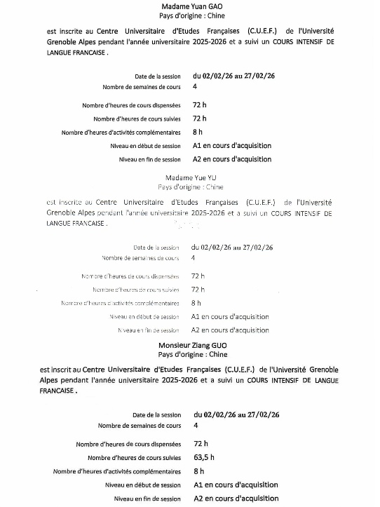 此次研学不仅是一次语言文化的沉浸体验,更是一场专业素养的跨国拓展。三位学子走进国际课堂,在跨文化环境中学习交流,在与来自不同国家的师生互动中,深化了对全球健康议题的理解,也锻炼了在多元文化背景下表达专业观点的能力。研学期间,于悦、郭子昂进入Débutants班,高媛进入Élémentaire 1班。经过为期一个月的强化学习,三位同学均顺利完成学习任务,法语水平从初始A1等级提升至A2等级,展现出永利官网学子良好的学习风貌与专业素养。