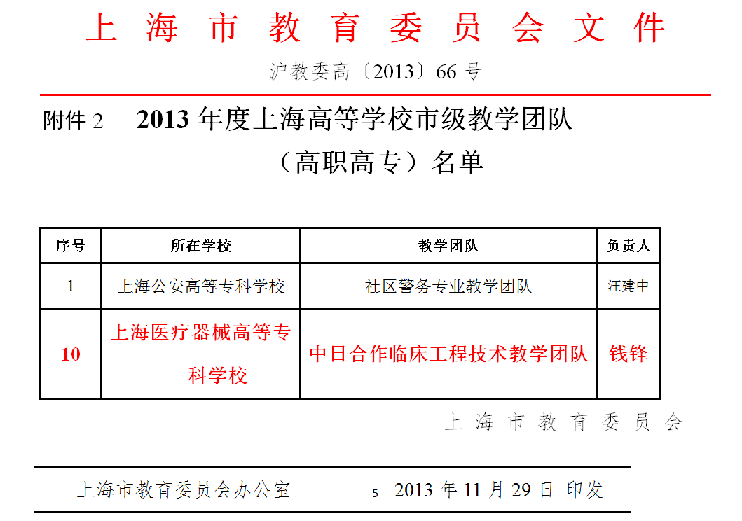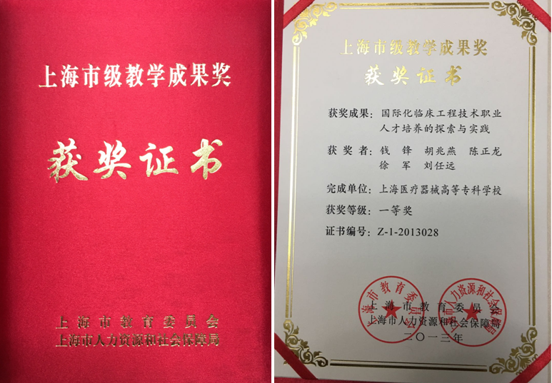 多年来临床工程技术人才培养的实践,得到了学校领导和业内同行专家的肯定,更得到了上级教育主管部门包括国家教育部和上海市教委的肯定,由专业主任钱锋负责申报的“国际化临床工程技术职业人才培养的探索与实践”首先于2013年获得了上海市教学成果一等奖,并由上海市教委推荐,报送国家教育部申报国家级教学成果奖。经过严格公正的评审,最终“国际化高职临床工程技术人才培养的探索与实践”于2014年又获得教育部国家级教学成果奖二等奖。中日合作临床工程技术教学团队也分别于2011年获得“教育先锋号”和2013年获得“上海市级教学团队”的荣誉称号。