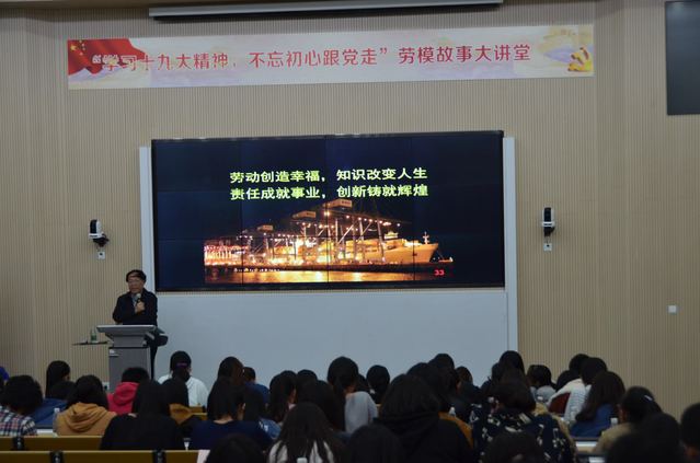 他在讲座中说到:爱国是创新之本,践行“爱国、敬业、诚信、友善”的价值观是成功的保证。他从自己成长的心路历程阐述了个人的发展离不开党和国家的培养,也始终如一地弘扬爱国情怀和创新精神,并激励大家今天努力学习,在岗位上努力创新,明天也会是一名劳模。他鼓励在座的师生们,在校学本领,岗位勤创新,要抓住新时代、新机遇,以新理念融入“大众创业、万众创新”的社会大环境。讲座中他以“抓斗大王”、“去烟台看雪”、“圆珠笔的故事”和“拜年”等生动的事迹诠释了坚持不懈、无私奉献、攻坚克难、爱岗敬业、诚信友善、共享发展的劳模精神。最后,他以“劳动创造幸福,知识改变人生,责任成就事业,创新铸就辉煌”四句话结束了讲座,台下响起了热烈的掌声。