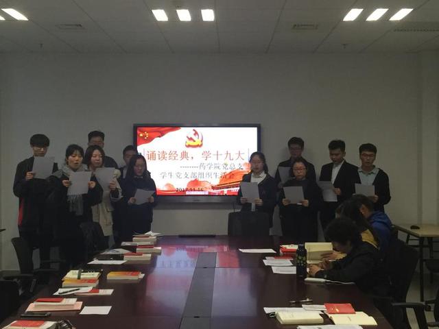 为了学习宣传贯彻党的十九大精神,学懂弄通做实党的十九大精神,11月16日,药学院党总支学生党支部开展了“诵读经典,学习贯彻党的十九大精神”的专题组织生活会。参加本次组织生活会的有党总支副书记叶婧,学生党支部书记邵真如,支部组织委员章蓓意、支部委员曹天晓、付艳君和孙云老师,以及七名学生预备党员和四名拟发展对象。
