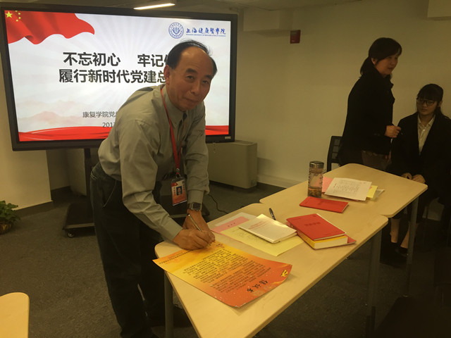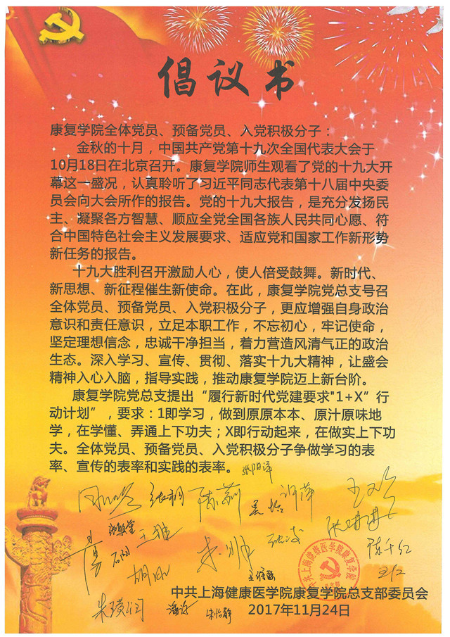 大家一致认为,要争做学习的表率、宣传的表率和实践的表率的“三个表率”。纷纷签约“学习贯彻十九大精神倡议书”,确保把十九大精神学深、学精、学透;使十九大精神真正入耳、入脑、入心;确保十九大精神不折不扣在学院工作中全面准确贯彻落实。(康复学院)