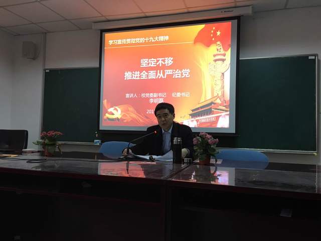 12月28日下午,校党委副书记、纪委书记李明磊在北苑4号楼602室以“关于坚定不移全面推进从严治党”为主题作了学习宣传贯彻十九大专题辅导报告。行政第二联合党支部、基础医学院直属党支部以及体育教学部直属党支部全体党员聆听了报告。