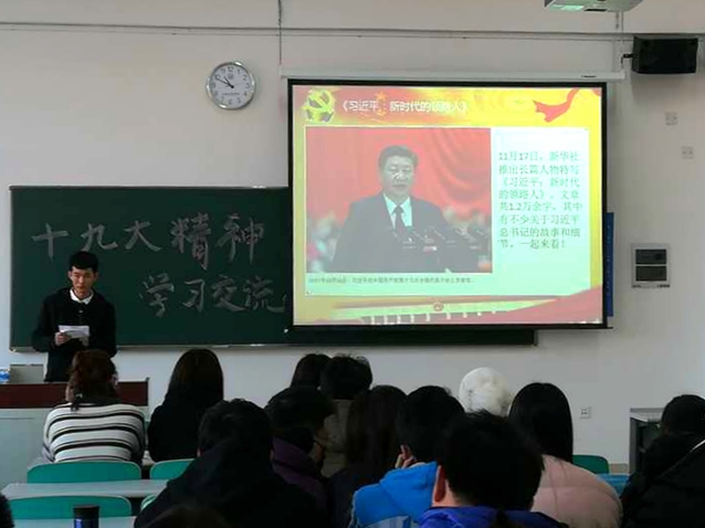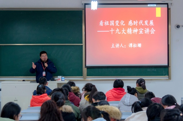 在开展组织生活会期间,各班团支部以多种形式读原著、学原文、悟原理。学院团总支书记谭松珊作为校十九大宣讲团成员,开展多场宣讲活动,带领青年学生回顾党的光辉历史,了解自2012年党的十八大召开以来我们党进行的伟大斗争、建设伟大工程、推进伟大事业所取得举世瞩目的成就,与团员青年共同交流如何在新时期投身实现伟大梦想历史进程的责任与担当。通过宣讲活动,同学们对十九大报告的精神领会更加全面,也更加直观,对十九大报告中所描绘的发展蓝图了解得更加深入。