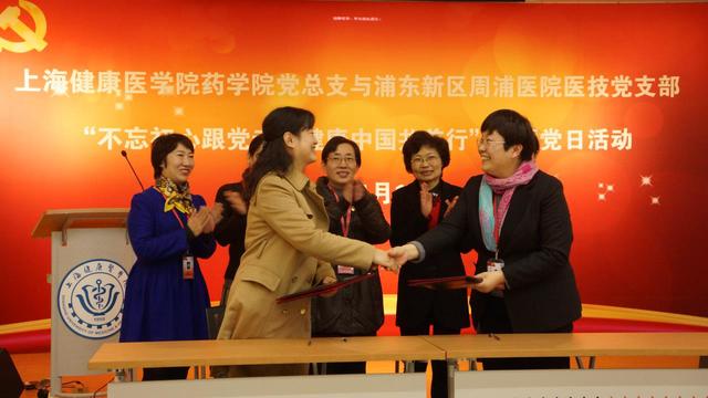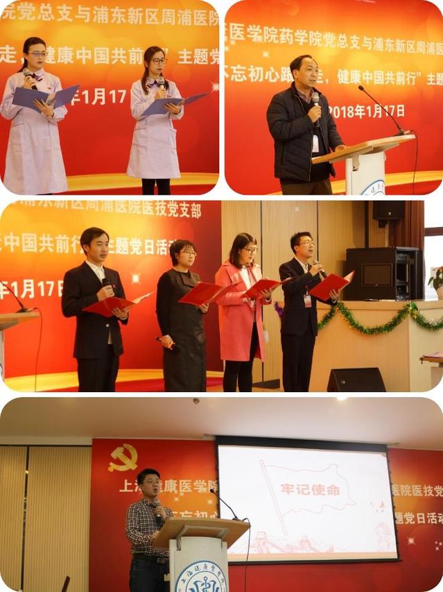 为深入开展“不忘初心、牢记使命,贯彻落实党的十九大精神”学习实践活动,推动“两学一做”学习教育常态化制度化,药学院党总支与浦东新区周浦医院医技党支部共商基层党组织共建工作。1月17日下午,两个党组织共同开展了“不忘初心跟党走,健康中国共前行”主题党日活动,校党委书记郑沈芳、周浦医院党委书记施庆红、校组织部部长郭戎静、周浦医院各党支部书记、校各基层党支部书记等87人参加了活动。活动由药学院党总支书记徐一新主持。