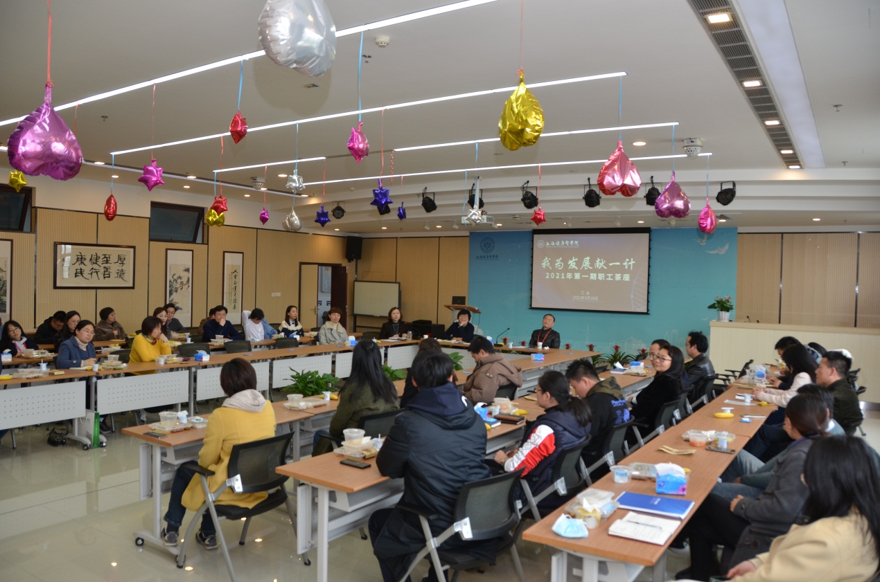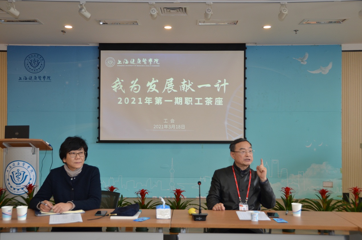 本次茶座,是结合“两会”期间习近平总书记看望参加政协会议的医药卫生界教育界委员时发表的重要讲话及国务院办公厅、上海市人民政府办公厅《关于加快医学教育创新发展的指导意见和实施意见》,校工会联合相关职能部门为如何落实立德树人,优化人才培养结构,全面提高人才培养质量,如何把创新和能力培养融入医学教育,为特色专业的打造和创新人才培养建言献策。到会老师们都积极举手发言。从学风建设、学分制试点到专任教师选修课的开设,大家都给出了很好的意见和建议;对教学场地配备、教学设备的更新也给出了中肯的意见;对教学的评教和督导如何进一步提高教学质量和发挥教师主观能动性,到实训中心的整合也提出希望学校能高度关注;对教学图书的采购、实验室的设备共享及使用,到如何拓宽实验场所,整合园区的资源进行实训课的教学也在茶座上提出了思考;在座的代表对每节课的时间设置、排课的科学性和合理性提出了创新性的思考。老师们踊跃发言,气氛轻松活跃。很多老师把自己部门或是周围老师的意见、想法一并带到会上,与校领导、职能部门面对面沟通。相关职能部门负责人也都对老师们提出的意见、建议或是想法及时回复、回应。