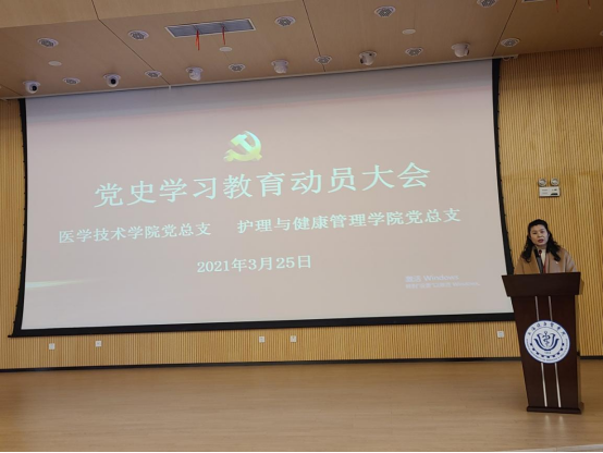 3月25日下午,护管与医技学院党总支在新南苑4号楼一楼300人报告厅联合举办二级学院党史学习教育动员会暨党史学习教育专题报告会,传达了校党委党史学习教育的部署、要求并开展了一场党史专题学习。两个学院的全体教职员工、学生党员和入党积极分子代表参加学习。会议由护管学院党总支副书记、院长朱爱勇主持。