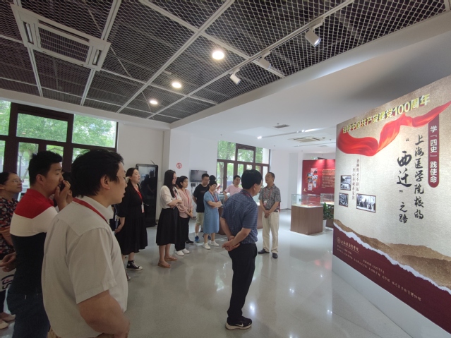 为庆祝中国共产党成立100周年,加强党史学习教育和教师思想政治教育,6月3日下午,文理教学部直属党支部组织全体党员和教师参观南苑图书馆底楼的上海医学院校“西迁之路”主题展。