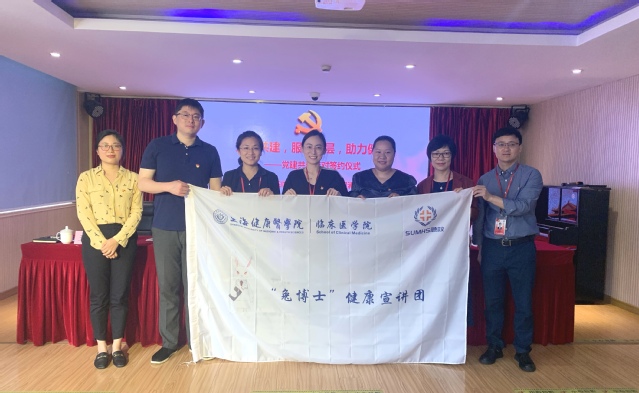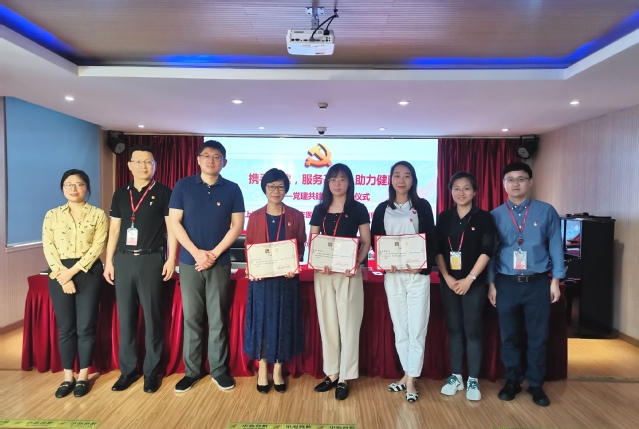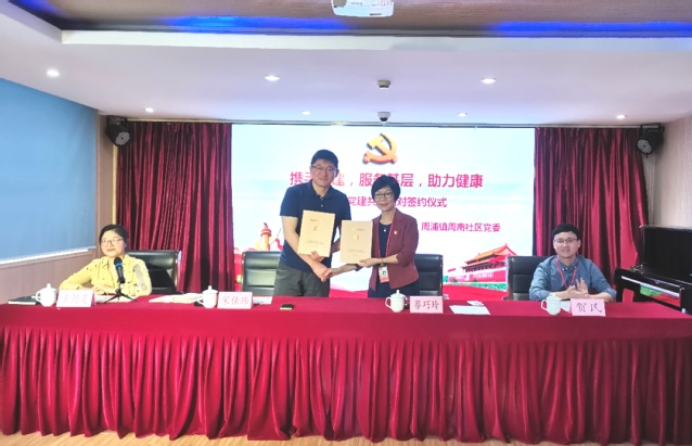 在仪式环节,宋佳玮和蔡巧玲分别进行了致词。宋佳玮对大家的到来表示欢迎,对本次共建活动的背景、内容和意义进行了介绍,希望双方今后各自发挥党建优势,提升党建工作水平。蔡巧玲谈到,本次党建共建正值中国共产党百年华诞之际,在党史学习教育期间,双方聚焦“我为群众办实事”,依托各自单位资源,通过定期开展专题学习、健康宣讲、志愿服务、暑期社会实践、急救知识宣讲普及、“微心愿”帮扶计划等党建活动,助力提升基层健康水平,发挥人才培养协同效应,实现党建与业务合作良性互动,努力提高共建工作的内涵,将党史学习教育落到实处。随后,两位书记进行了现场共建签约。