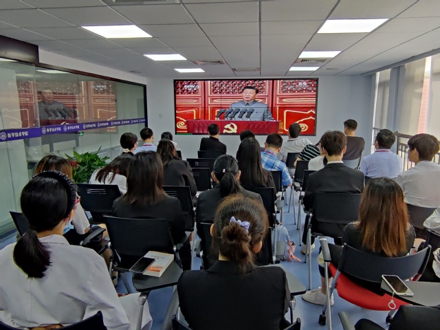 伴随着声声震寰宇的100响礼炮,步步铿锵有力的国旗护卫队,朝气蓬勃的青年少年代表献词,大会开始。在直播电视前,医学技术学院师生党员佩戴党徽、团员佩戴团徽,着正装以庄严肃穆的姿态献上对中国共产党100年华诞的祝福。